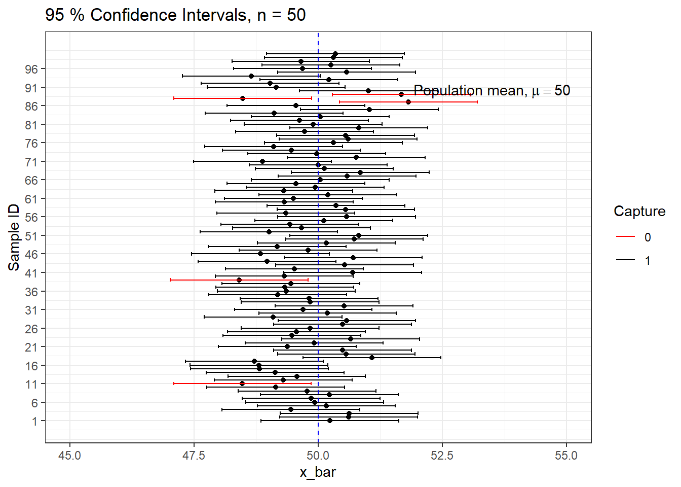We can see that out of 100 CIs , 95 of them contain true population mean \(\mu=50\) and the rest 5 do not.
